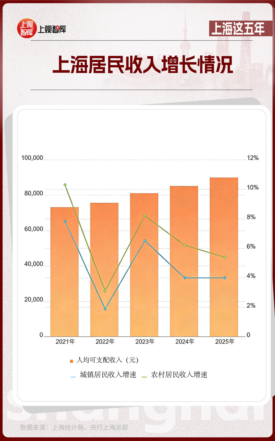 2025年,上海人均可支配收入超過(guò)了9萬(wàn)元,對(duì)比2021年增長(zhǎng)了17.9%;人均消費(fèi)支出逼近5.5萬(wàn)元,對(duì)比2021年增長(zhǎng)了12.0%;全市社會(huì)消費(fèi)品零售總額增長(zhǎng)4.6%。