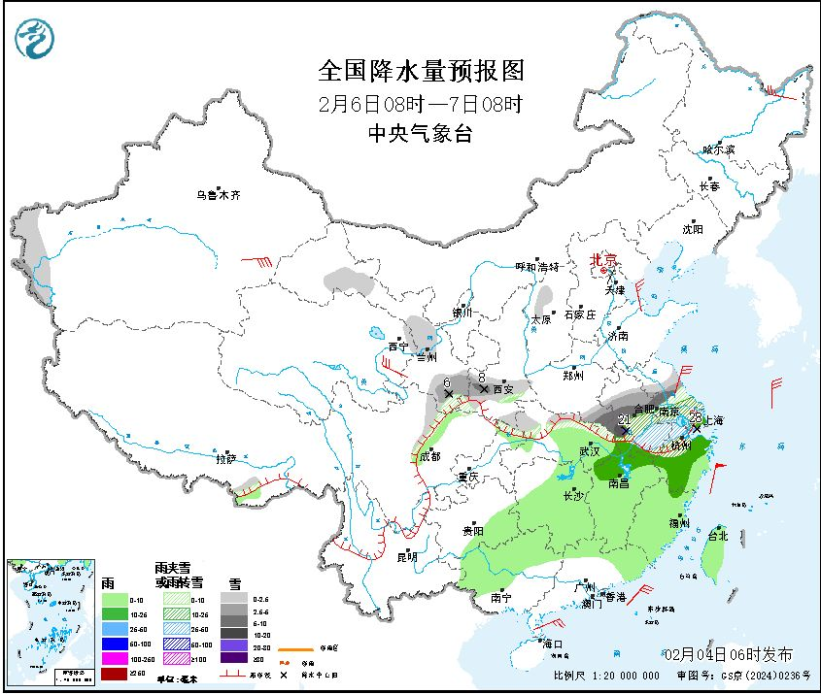 2月6日08時至7日08時,新疆南部、甘肅河西和中南部、陜西中南部、湖北北部、河南南部、安徽中南部、江蘇中南部、上海、浙江北部等地部分地區(qū)有小到中雪或雨夾雪,其中,陜西中部、河南南部、安徽中南部、江蘇中南部、浙江北部等地部分地區(qū)有大到暴雪或雨夾雪,安徽西南部局地大暴雪(20~21毫米)。江漢東部、江南大部、重慶東北部、華南北部、廣西西南部、廣東東南部、臺灣島等地部分地區(qū)有小到中雨,其中,浙江北部等地部分地區(qū)有大雨(25~28毫米)。黑龍江東北部、青海東部、新疆南疆盆地等地部分地區(qū)有4~6級風(fēng),陣風(fēng)6~7級,東海大部、臺灣海峽將有6~8級風(fēng)、陣風(fēng)9級,黃海中部和南部、臺灣以東洋面、南海東北部將有5~7級風(fēng)、陣風(fēng)8級。