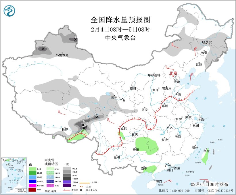 2月4日08時至5日08時,內(nèi)蒙古東北部、東北地區(qū)中東部、新疆北疆大部和南疆盆地東南部、西藏南部和東部、青海中南部、甘肅南部等地部分地區(qū)有小雪或雨夾雪,其中,新疆北疆東部和伊犁河谷、西藏東部等地部分地區(qū)有中到大雪,局地暴雪(10~15毫米)。四川盆地西南部、貴州東部、湖南西部、廣西東南部、廣東西南部、臺灣島大部等地部分地區(qū)有小雨。內(nèi)蒙古東南部和中部、河北北部、西藏北部、川西高原北部等地部分地區(qū)有4~5級風(fēng),陣風(fēng)6~7級,南海東北部將有5~7級風(fēng)、陣風(fēng)8級。