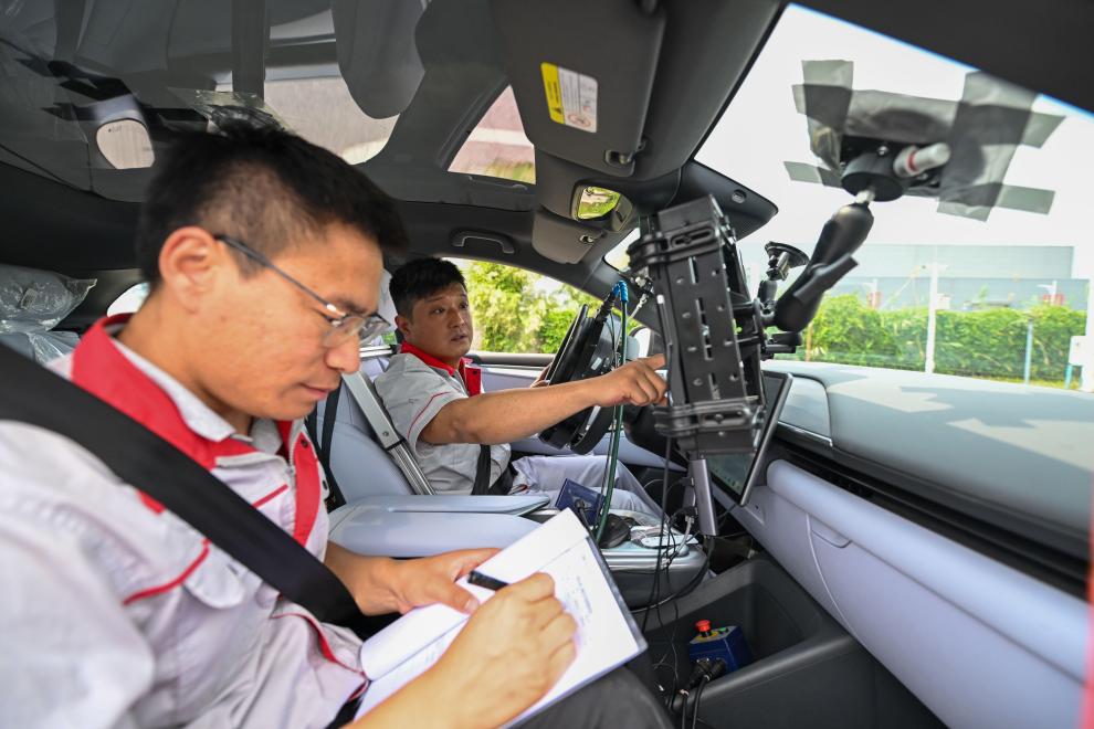 測試員在一輛智能網聯(lián)汽車內做測試。新華社記者 孫凡越 攝