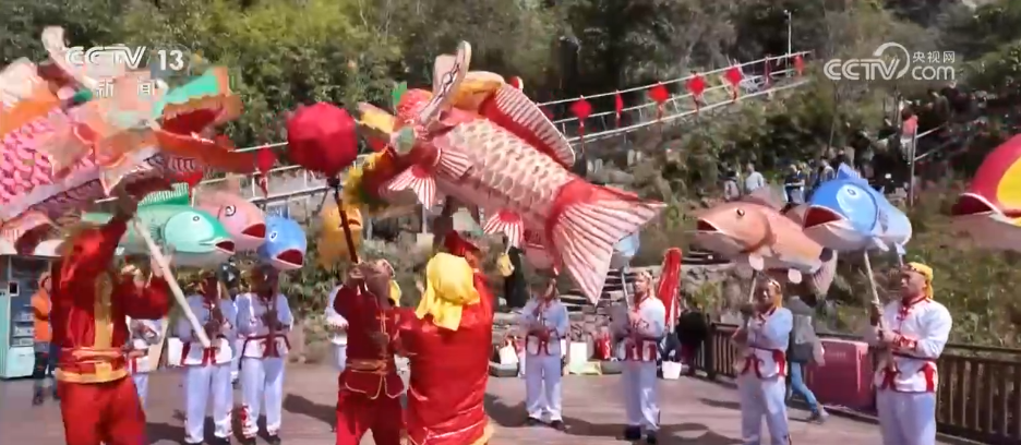 記者身后的九鯉湖景區(qū),湖光山色、層巒疊翠,展現(xiàn)出南方山岳特有的靈秀。景區(qū)里最熱門的打卡點之一,叫做“一線天”。這里最窄處不到30厘米,一次只能容一人貼壁通過,游客需要側(cè)身慢慢穿行,在狹窄石縫間體驗攀登的樂趣。記者身旁正在巡游的就是當?shù)氐姆沁z——店下魚燈。大家看,一盞盞彩繪魚燈隨著隊伍前進上下擺動,像魚兒在水里游,特別靈動。在過去,漁民會用魚燈祈愿出海平安、豐衣足食。過年的時候看魚燈,也寓意“年年有余、風(fēng)調(diào)雨順”。