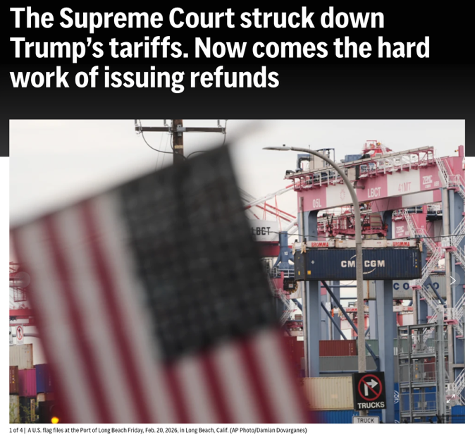 △美聯(lián)社報(bào)道,最高法院駁回特朗普的關(guān)稅政策后,艱巨的退還稅款任務(wù)開(kāi)始了
