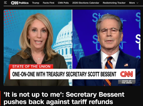 當(dāng)?shù)貢r(shí)間2月22日,美國(guó)財(cái)政部長(zhǎng)斯科特·貝森特在接受美國(guó)有線電視新聞網(wǎng)(CNN)采訪時(shí),被主持人達(dá)娜·巴什追問(wèn)著一個(gè)看似直接、卻難以直接回答的問(wèn)題:既然最高法院已裁定特朗普政府依據(jù)《國(guó)際緊急經(jīng)濟(jì)權(quán)力法》(IEEPA)征收的大范圍“緊急關(guān)稅”缺乏授權(quán),那么此前收上來(lái)的巨額關(guān)稅款,退不退、怎么退?