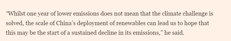同時,文章稱南安普頓大學的一位氣候科學家表示,這些數(shù)據(jù)令人鼓舞,因為它們表明中國對綠色能源的大規(guī)模投資開始轉(zhuǎn)化為可衡量的成果?!半m然一年的減排并不意味著氣候挑戰(zhàn)已經(jīng)解決,但中國在可再生能源方面的大規(guī)模發(fā)展讓我們有理由期待,這或許將是其排放量持續(xù)下降的開端。”