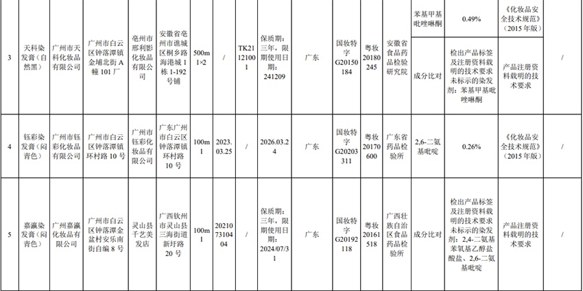 通告顯示,本次不符合規(guī)定的23批次化妝品涉及廣州市天科化妝品有限公司、廣州市鈺彩化妝品有限公司、廣州嘉瀛化妝品有限公司、廣州市白云區(qū)雅頓化妝品廠、廣州有孚精細(xì)化工有限公司、廣州雅升生物科技有限公司等,包括染發(fā)膏、防曬乳、面膜、保濕霜等產(chǎn)品。