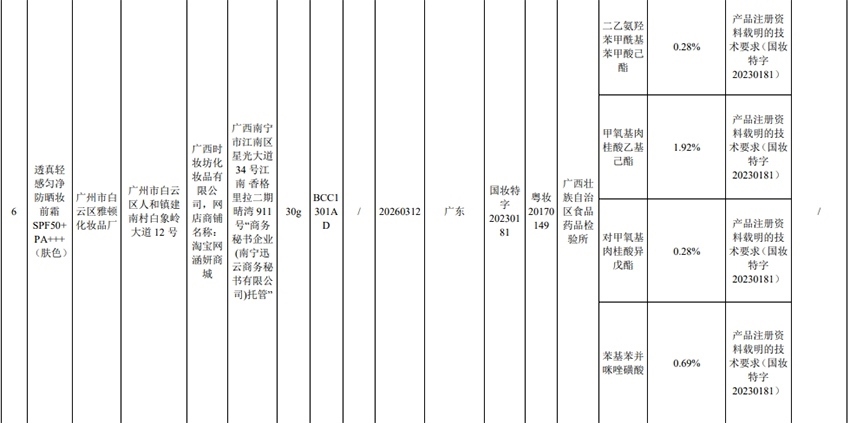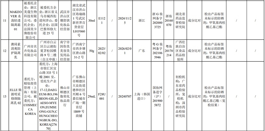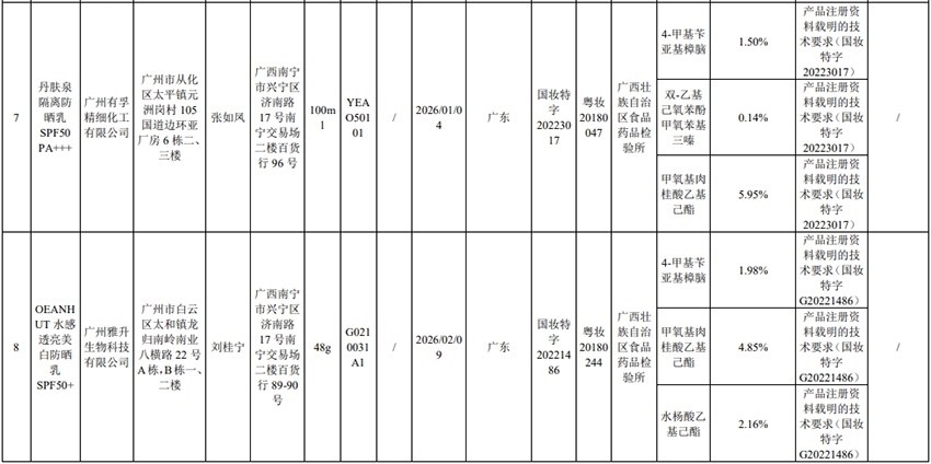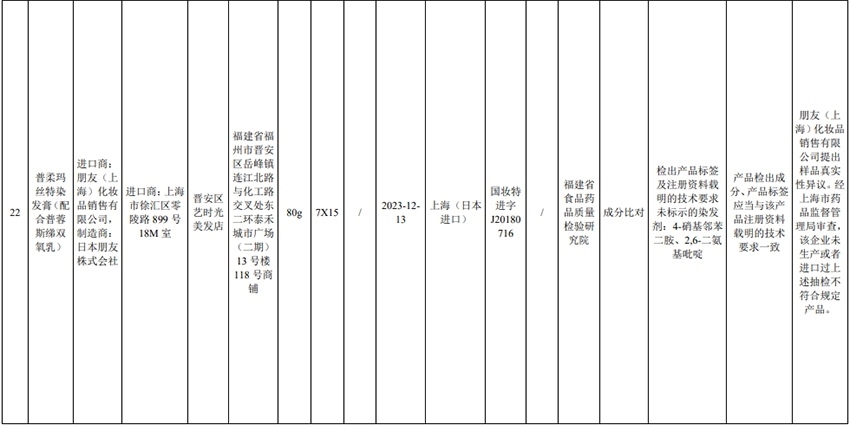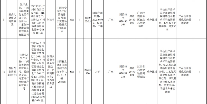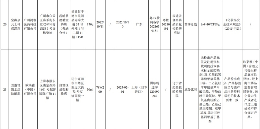 記者注意到,其中,產(chǎn)品標(biāo)簽標(biāo)示為歐萊雅(中國(guó))有限公司生產(chǎn)的蘭蔻輕透水漾防曬乳(標(biāo)示批號(hào):78W200)“未檢出產(chǎn)品標(biāo)簽及注冊(cè)資料載明的技術(shù)要求標(biāo)示的防曬劑”;產(chǎn)品標(biāo)簽標(biāo)示為朋友(上海)化妝品銷售有限公司進(jìn)口的普柔瑪絲特染發(fā)膏(配合普蓉斯綈雙氧乳)(標(biāo)示批號(hào):7X15)“檢出產(chǎn)品標(biāo)簽及注冊(cè)資料載明的技術(shù)要求未標(biāo)示的染發(fā)劑”;產(chǎn)品標(biāo)簽標(biāo)示為資生堂(中國(guó))投資有限公司經(jīng)銷的安熱沙金燦倍護(hù)防曬啫喱(標(biāo)示批號(hào):1356TD)“產(chǎn)品標(biāo)簽與注冊(cè)資料載明的技術(shù)要求不一致”、“未檢出產(chǎn)品標(biāo)簽標(biāo)示的防曬劑”、“未檢出注冊(cè)資料載明的技術(shù)要求標(biāo)示的防曬劑”。