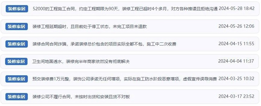 其實(shí),有著同樣遭遇的消費(fèi)者不在少數(shù)。公開報(bào)道顯示,今年以來有多個(gè)家裝機(jī)構(gòu)分公司或經(jīng)銷商跑路,還有個(gè)別不良裝修公司在短時(shí)間內(nèi)聚收大量預(yù)付款后攜款跑路,給消費(fèi)者帶來經(jīng)濟(jì)財(cái)產(chǎn)損失?!叭嗣裢对V”梳理發(fā)現(xiàn),除閉店跑路外,目前平臺上涉及家裝消費(fèi)類的投訴問題多聚焦于——