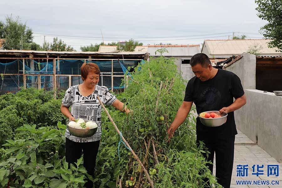 姜玉龍、宋朋艷夫婦在菜園中收獲勞動果實。新華網(wǎng)發(fā)