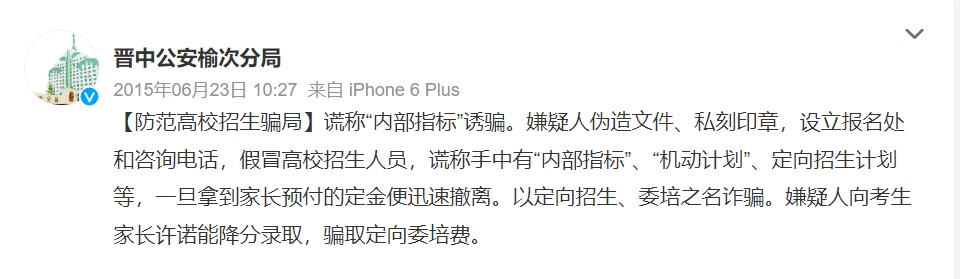 每年各省市投檔分?jǐn)?shù)線公布后,總是“幾家歡喜幾家愁”,不法分子也在此刻瞄準(zhǔn)了落榜考生。根據(jù)各地公安部門通報(bào),一些不法分子假冒高校招生人員或聲稱“熟悉”高校招生辦,點(diǎn)對(duì)點(diǎn)與相關(guān)考生取得聯(lián)系。隨后謊稱有某高校的“內(nèi)部指標(biāo)”“機(jī)動(dòng)計(jì)劃”,或是以“定向招生”“委培招生”等名義“降分錄取”考生,誘騙其繳納相關(guān)費(fèi)用。需要注意的是,在實(shí)施這些詐騙行為時(shí),不法分子往往使用電腦合成技術(shù)偽造“招生文件”“學(xué)校公章”等,騙取考生及家長(zhǎng)的信任。