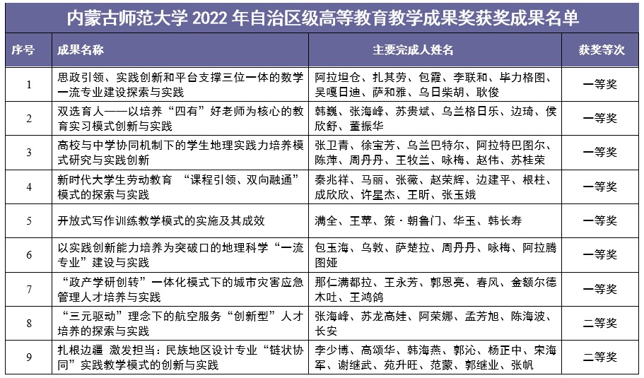 北疆新聞網(wǎng)、北疆新聞APP、北疆云消息(記者 李艷紅)近日,內(nèi)蒙古自治區(qū)教育廳發(fā)布了《關(guān)于公布2022年自治區(qū)級高等教育教學(xué)成果獎(jiǎng)獲獎(jiǎng)成果的通知》,內(nèi)蒙古師范大學(xué)微官網(wǎng)由數(shù)學(xué)科學(xué)學(xué)院牽頭、黨委書記阿拉坦倉主持的《思政引領(lǐng)、實(shí)踐創(chuàng)新和平臺(tái)支撐三位一體的數(shù)學(xué)一流專業(yè)建設(shè)與實(shí)踐》等17個(gè)推薦至自治區(qū)的教學(xué)成果均獲獎(jiǎng),實(shí)現(xiàn)了100%的獲獎(jiǎng)率。其中,一等獎(jiǎng)7項(xiàng),二等獎(jiǎng)4項(xiàng),三等獎(jiǎng)6項(xiàng)。一等獎(jiǎng)獲獎(jiǎng)數(shù)量及總獲獎(jiǎng)率位居全區(qū)之首。