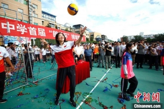 圖為郎平為陳經(jīng)綸中學(xué)首屆“郎平杯”排球聯(lián)賽開球。中新社記者 富田 攝
