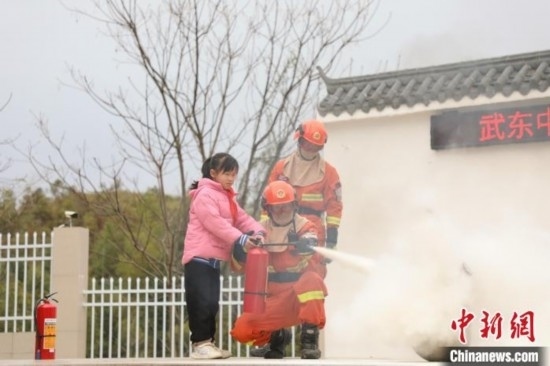 圖為消防員為師生講解手提式干粉滅火器的使用原理,并設(shè)置“火災(zāi)”場景,組織師生實操體驗。 王治康 攝