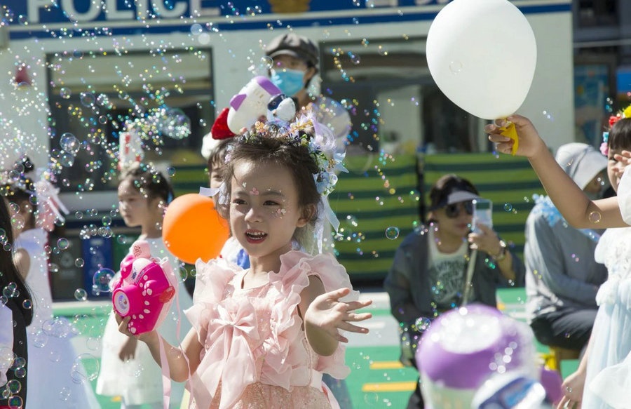 小朋友沉浸在泡泡的童話世界里
