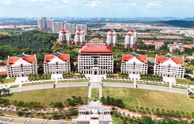 碧空悠悠,湖水如鏡。西洋風(fēng)格搭配閩南傳統(tǒng)燕尾脊屋頂?shù)慕ㄖ溆谑[翠之中,陳嘉庚雕塑在晨光中投下長長的影子,學(xué)生們邁著輕快的步伐趕往教室。廈門大學(xué)馬來西亞分校(簡稱“廈大馬校”)的清晨充滿生機(jī)。如今,這所高等學(xué)府成為中馬高等教育合作的旗艦項(xiàng)目。