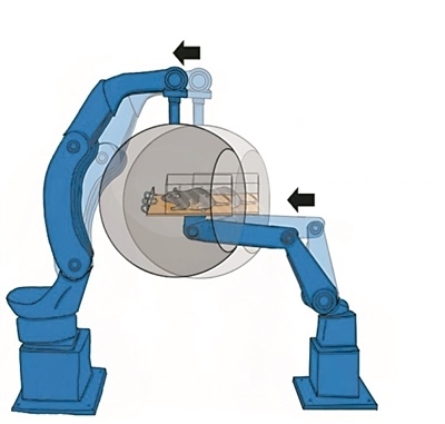 為了破解動(dòng)物在完全黑暗的管道、隧道中也能迅速轉(zhuǎn)彎、穿越障礙,并準(zhǔn)確地抵達(dá)目的地的秘密,科學(xué)家們設(shè)計(jì)了一種獨(dú)特的運(yùn)動(dòng)模擬器。該模擬器采用同步的工業(yè)機(jī)械臂來模擬不同的運(yùn)動(dòng)狀態(tài)。實(shí)驗(yàn)中,老鼠被放在模擬器中接受各種運(yùn)動(dòng)刺激,儀器同時(shí)報(bào)告它們感知到的運(yùn)動(dòng)方向。結(jié)果顯示,老鼠對極其微小的氣流變化都異常敏感,它們確實(shí)能夠利用這種氣流信息,增強(qiáng)自身對運(yùn)動(dòng)的感知和判斷力。