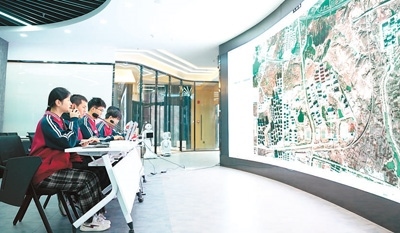 學(xué)生在學(xué)校低空空域管控服務(wù)中心進(jìn)行無(wú)人機(jī)飛行作業(yè)的航線規(guī)劃、飛行任務(wù)管理。