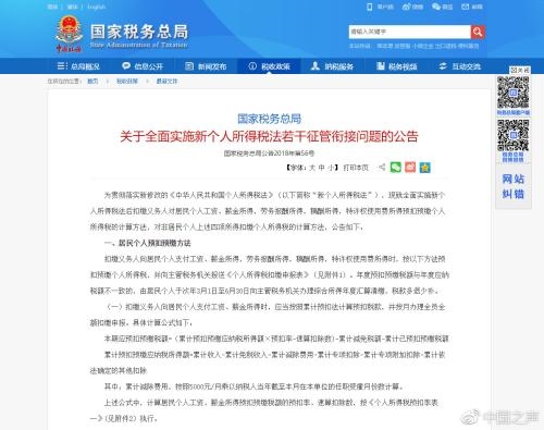據(jù)中國之聲《新聞縱橫》報道:新修改的個人所得稅法將于2019年1月1日正式實施。國家稅務(wù)總局日前發(fā)布公告明確了全面實施新個人所得稅法的征管辦法,確保新舊稅制平穩(wěn)過渡。