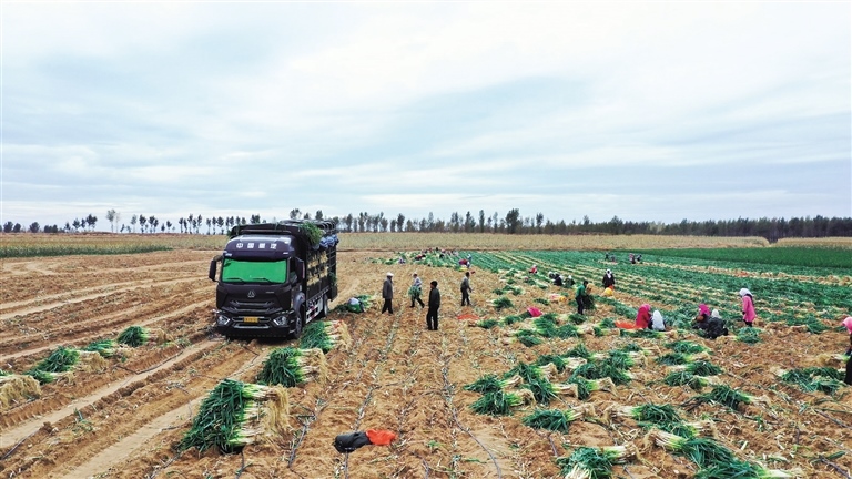 深秋時節(jié),通遼市奈曼旗沙日浩來鎮(zhèn)水泉嘎查大蔥種植基地一派繁忙的豐收景象,人們井然有序地拔蔥、捆綁、裝車,臉上洋溢著豐收的喜悅。
