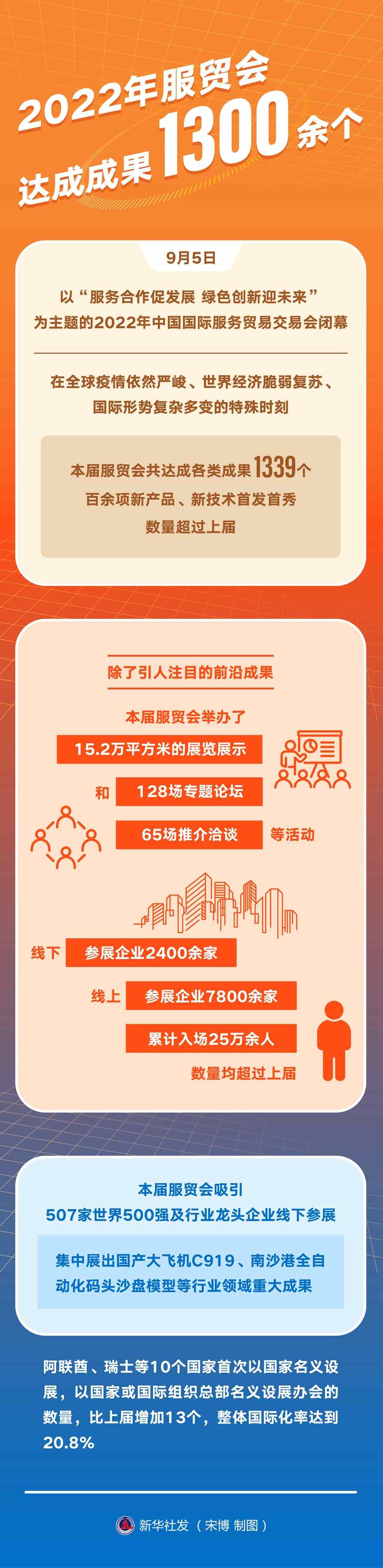 9月5日,以“服務(wù)合作促發(fā)展綠色創(chuàng)新迎未來”為主題的2022年中國國際服務(wù)貿(mào)易交易會(huì)閉幕。在全球疫情依然嚴(yán)峻、世界經(jīng)濟(jì)脆弱復(fù)蘇、國際形勢復(fù)雜多變的特殊時(shí)刻,本屆服貿(mào)會(huì)共達(dá)成各類成果1339個(gè),百余項(xiàng)新產(chǎn)品、新技術(shù)首發(fā)首秀,數(shù)量超過上屆。