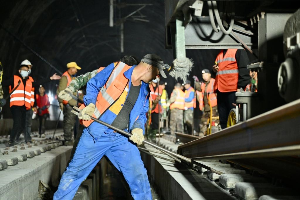 建設者們在完成全線鋼軌的最后鋪架。(中國鐵路成都局集團公司供圖)