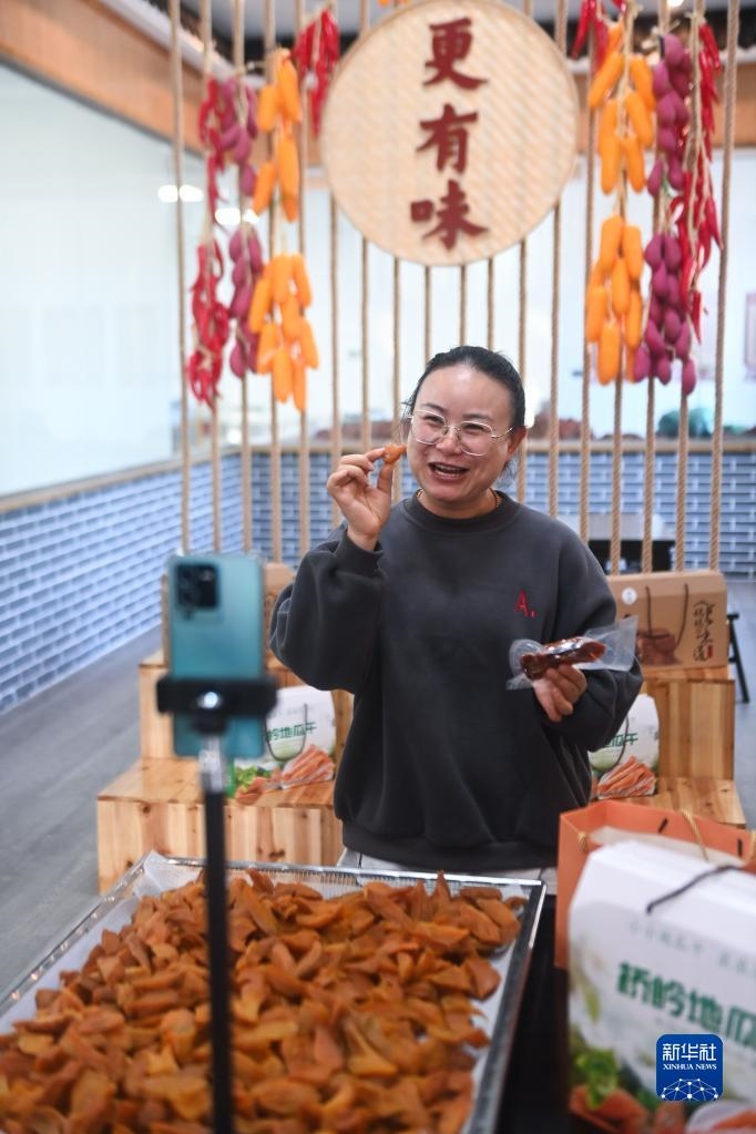 11月23日,黨員志愿者在浙江省建德市更樓街道橋嶺村共富工坊的直播間里進(jìn)行網(wǎng)上直播銷(xiāo)售地瓜干。新華社記者 徐昱 攝