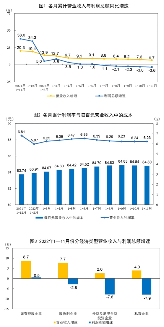 國家統(tǒng)計(jì)局工業(yè)司高級統(tǒng)計(jì)師朱虹表示,11月份,受疫情反彈和需求不足等因素影響,工業(yè)生產(chǎn)有所放緩,企業(yè)經(jīng)營壓力加大,但利潤結(jié)構(gòu)持續(xù)改善。具體來看,1—11月份工業(yè)企業(yè)效益狀況主要呈現(xiàn)以下特點(diǎn):