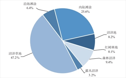 2022年度全國國土變更調查初步匯總結果顯示,全國共有濕地2357.3萬公頃。其中,紅樹林地2.9萬公頃,森林沼澤220.7萬公頃,灌叢沼澤75.4萬公頃,沼澤草地1112.9萬公頃,沿海灘涂149.9萬公頃,內陸灘涂602.4萬公頃,沼澤地193.2萬公頃。