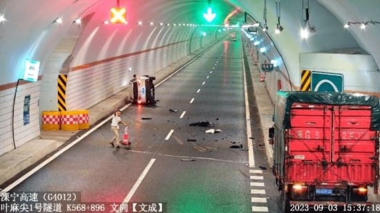 9月3日下午,在G4012溧寧高速葉麻尖隧道內(nèi),一輛小車碰撞隧道右側(cè)檢修帶,發(fā)生側(cè)翻,零部件散落一地。車內(nèi)3人被困,無法脫身,情況十分危險(xiǎn)。1分鐘后,一輛牌照為浙G52FJ2的貨車經(jīng)過,司機(jī)李平江師傅見狀,立即把車停在緊急停車帶內(nèi),迅速下車并拿起隧道一側(cè)的隔離錐放在事故車后,用手勢示意后方來車減速慢行,防止二次事故發(fā)生。