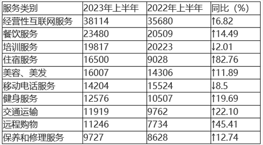 在具體服務(wù)投訴中,投訴量居前五位的分別為(如圖5、表5所示)經(jīng)營性互聯(lián)網(wǎng)服務(wù)、餐飲服務(wù)、培訓(xùn)服務(wù)、住宿服務(wù)、美容美發(fā)。與2022年上半年相比,住宿服務(wù)、遠(yuǎn)程購物、保養(yǎng)和修理服務(wù)進(jìn)入服務(wù)類投訴前十。其中,住宿服務(wù)、遠(yuǎn)程購物投訴量同比顯著增長,移動(dòng)電話服務(wù)投訴量同比有所下降。