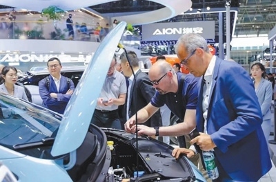 外國觀眾在北京車展廣汽埃安展臺(tái)參觀。王子牧攝
