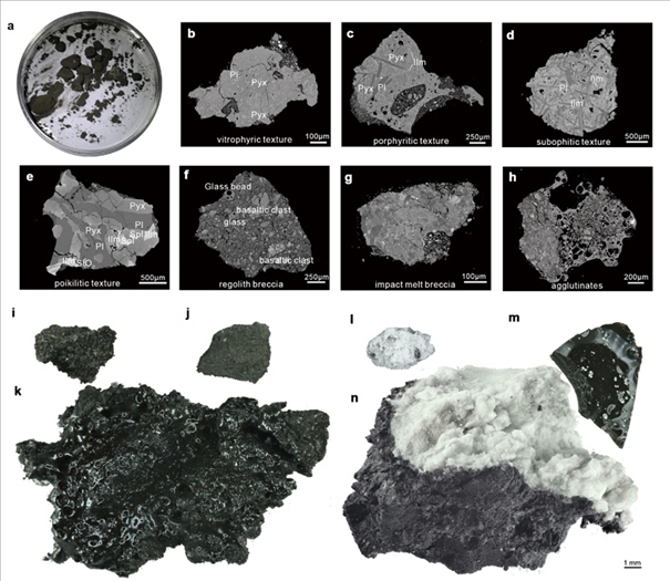 研究發(fā)現(xiàn),嫦娥六號(hào)采集的巖屑碎片主要由玄武巖、角礫巖、粘結(jié)巖、淺色巖石和玻璃質(zhì)物質(zhì)組成。其中,玄武巖碎片占總量的30%至40%,角礫巖和粘結(jié)巖由玄武巖碎屑、玻璃珠、玻璃碎片以及少量的斜長(zhǎng)巖和蘇長(zhǎng)巖等淺色巖石碎屑物質(zhì)構(gòu)成,進(jìn)一步揭示了樣品來(lái)源的復(fù)雜性。