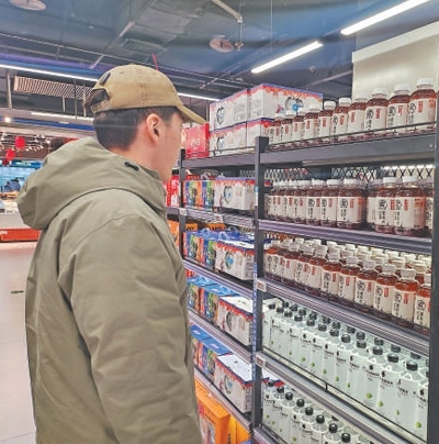 一名顧客在超市內(nèi)挑選元氣森林產(chǎn)品。