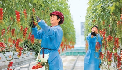 近年來(lái),江蘇省南通市通州區(qū)大力推動(dòng)智慧設(shè)施農(nóng)業(yè)、生態(tài)高效農(nóng)業(yè)園區(qū)發(fā)展,促進(jìn)農(nóng)業(yè)生產(chǎn)提質(zhì)增效。圖為通州區(qū)十總鎮(zhèn)圓宏萬(wàn)嘉智慧農(nóng)業(yè)基地的智能大棚內(nèi),工人在采摘成熟的小番茄。