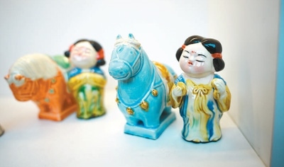 如今,唐三彩中常見的馬、駱駝等造型,形態(tài)更多元,顏色也更豐富。在洛陽(yáng)“鎮(zhèn)搗蛋”等文創(chuàng)店,憨態(tài)可掬的三彩小馬除了傳統(tǒng)配色,還有粉色、水藍(lán)色等符合年輕人審美的莫蘭迪色系。三彩小馬、三彩侍女俑的文創(chuàng)組合,成為不少游客的到店選擇。