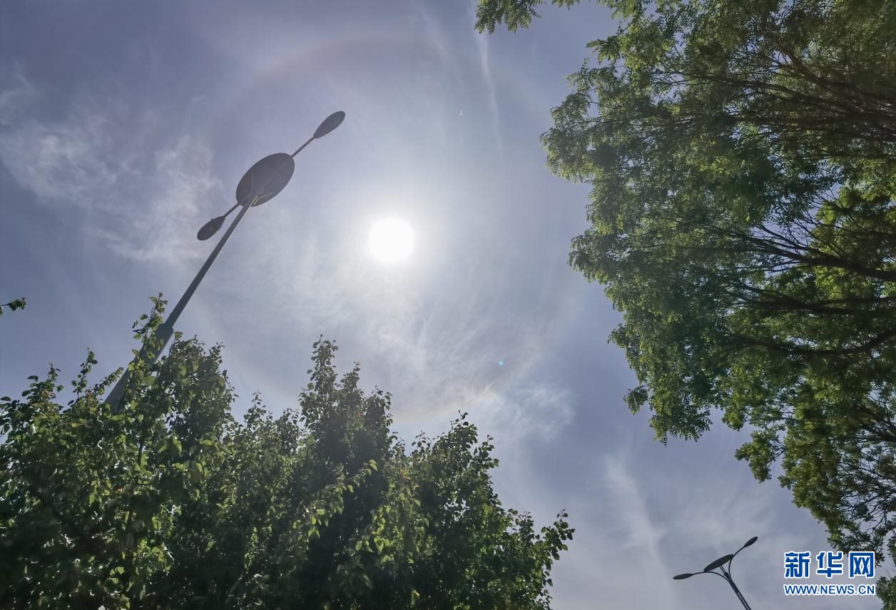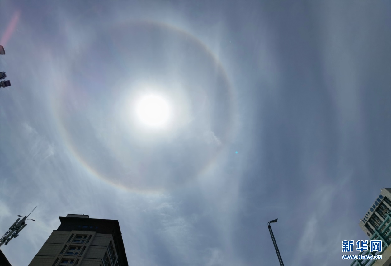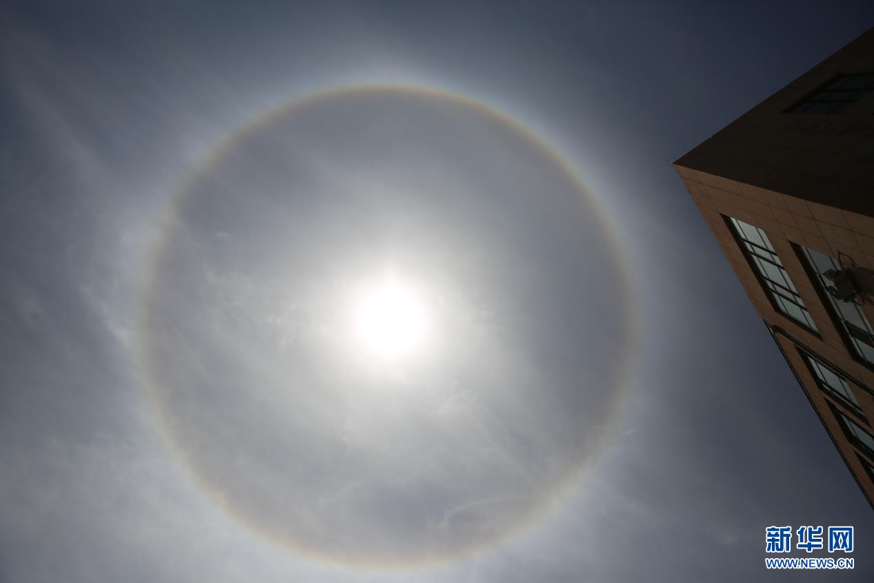 5月25日午后,內蒙古自治區(qū)呼和浩特市上空出現(xiàn)日暈,巨大的暈環(huán)圍繞在太陽四周,十分壯觀。新華網 楊騰格爾 攝