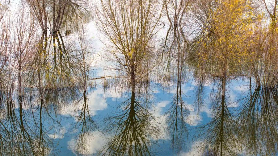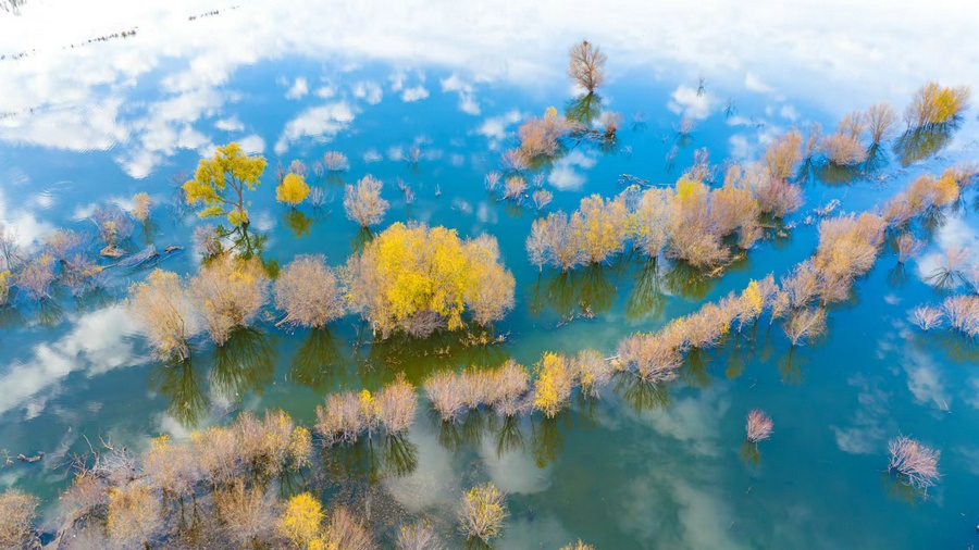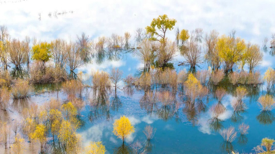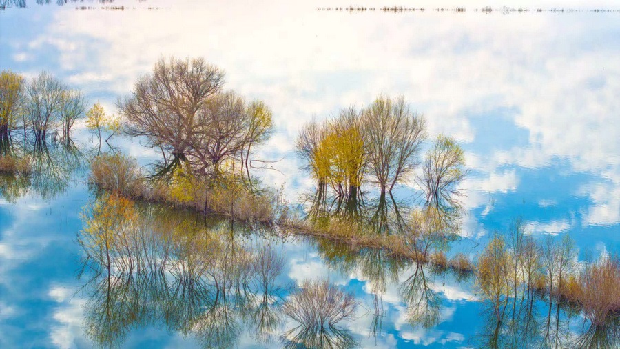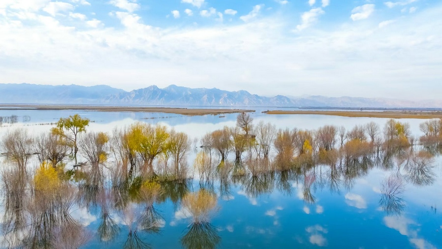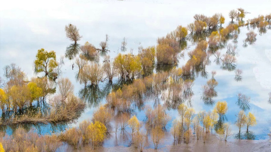 秋冬交替之際,位于呼和浩特土默特左旗的哈素海,水天一色,樹影倒映,構成一幅美麗的水彩畫卷,猶如人間仙境。 樂炎 攝影