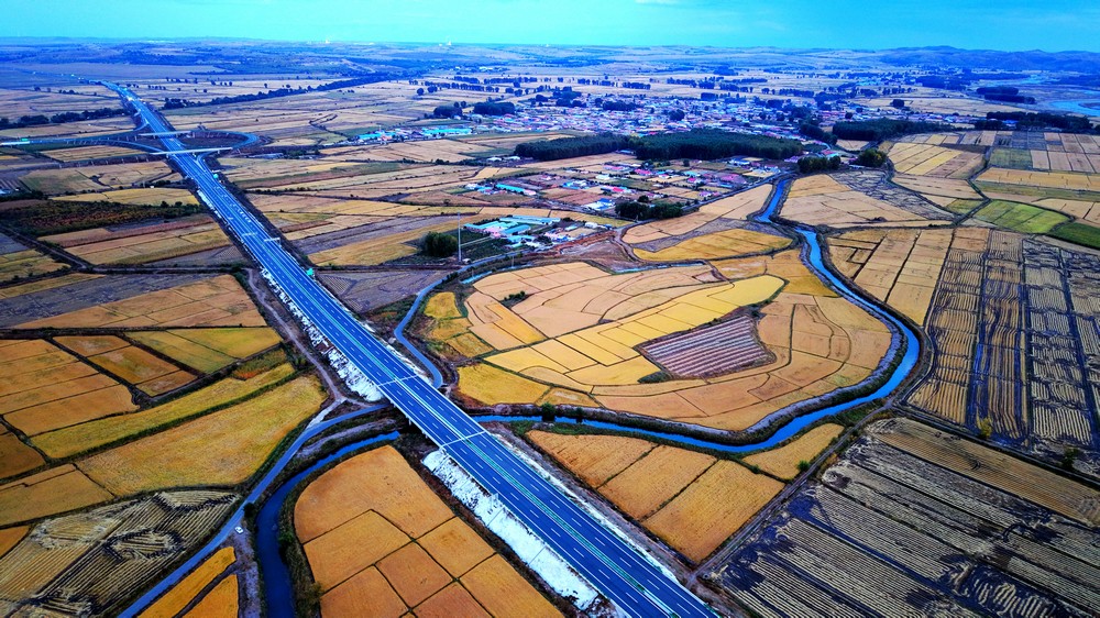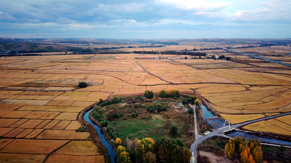 9月25日,空中俯瞰暮色中的三合村,遠(yuǎn)山如黛,稻田如畫,金色的麥浪,映襯著豐收的底色。