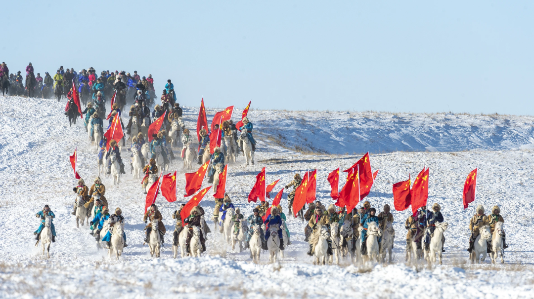 9時(shí)50分,在護(hù)旗方陣的護(hù)衛(wèi)下,鮮艷的五星紅旗冉冉升起,《義勇軍進(jìn)行曲》響徹云霄,萬(wàn)人肅立齊唱。方陣入場(chǎng)式上,200名農(nóng)牧民手持火紅的辣椒、金黃的向日葵和飽滿的西瓜,用豐收的喜悅“描繪”鄉(xiāng)村振興畫卷;400名“民族大家庭”方陣成員身著五彩盛裝,恰似民族團(tuán)結(jié)的斑斕錦緞;企業(yè)代表、干部職工代表、裁判、射箭手、搏克手等方陣依次入場(chǎng),大家精神抖擻,昂首闊步,展現(xiàn)出全旗各族人民團(tuán)結(jié)奮進(jìn)的精神面貌;最令人心潮澎湃的當(dāng)數(shù)蒙古馬方陣——百匹駿馬踏著《黑駿馬》的悠揚(yáng)琴聲奔騰而來(lái),馬蹄卷起草浪,鬃毛飛揚(yáng)如旗,將北疆兒女的豪邁氣概演繹得淋漓盡致。