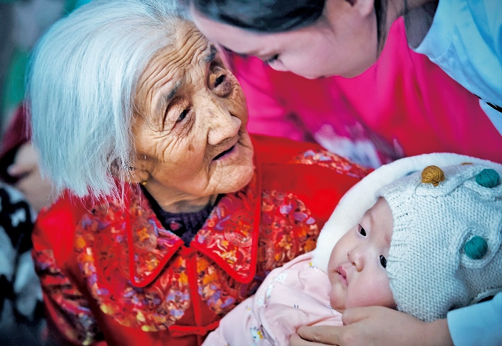 老人的兒孫們如今大多都在外學習、工作、做生意,大家族的成員日子都過得紅紅火火。對于老人來說,子孫滿堂是最幸福的事;對于孩子們來說,老人健康長壽,也是他們最大的愿望。五世同堂,98口人,百歲老人賈先女露出幸福的笑容。