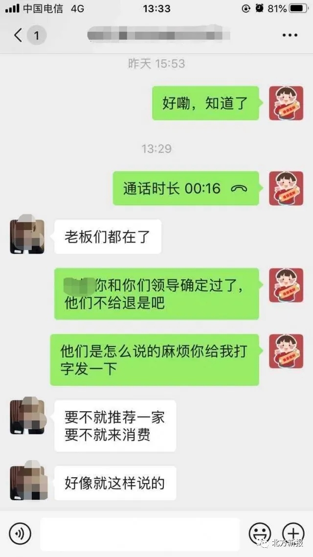 高先生提供給記者的一份微信聊天記錄顯示,當(dāng)高先生提出退還押金的要求時(shí),白泉山莊海世盛宴的工作人員告知,要不就推薦其他人到這里舉辦婚禮,要不就來(lái)這里消費(fèi)以抵消押金??傊?,押金是不能退的。