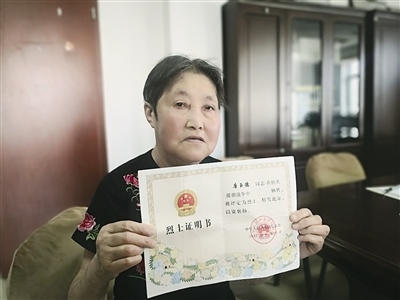 赫雅菊展示父親的烈士證明書