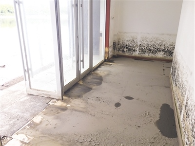 積水路面東側(cè)是已經(jīng)處于廢棄狀態(tài)的白廟子公安檢查站,檢查站內(nèi)外均殘留著被水泡過的痕跡。7月8日深夜,呼和浩特又降大雨。9日,記者再次來到緯五路看到,路面上的積水已經(jīng)蔓延到了檢查站樓內(nèi)。樓內(nèi)一片狼藉,從墻面上殘留的水印看,遭水淹最嚴(yán)重時樓內(nèi)積水深達(dá)五六十公分。