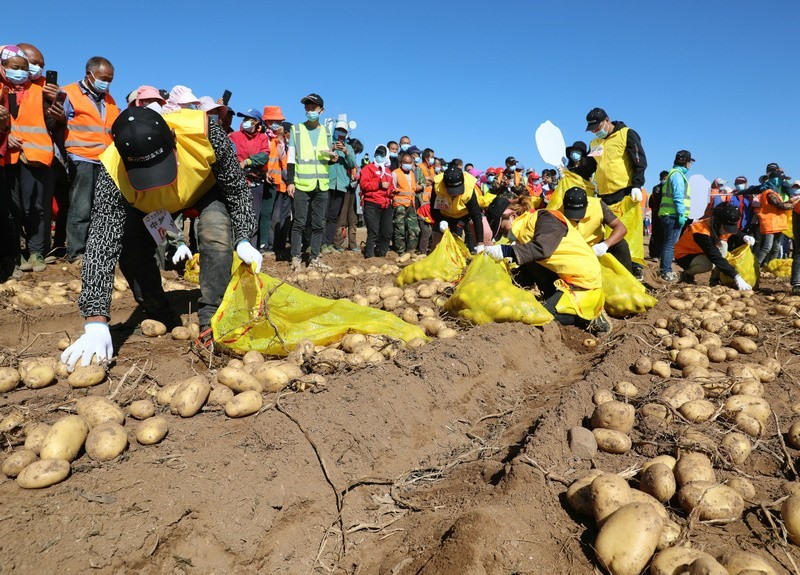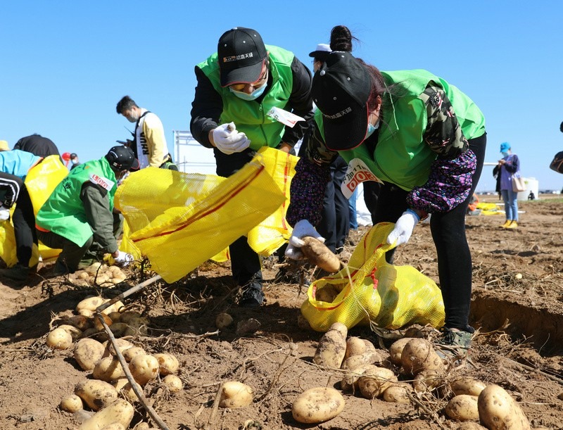 豐收節(jié)現(xiàn)場,還舉行了別開生面的土豆趣味運動會,6支代表隊參加了比賽,裁判員以速度計時、數(shù)量稱重等方式來決定最后的勝負,比賽過程熱火朝天,參賽者的臉上洋溢著喜悅的笑容。