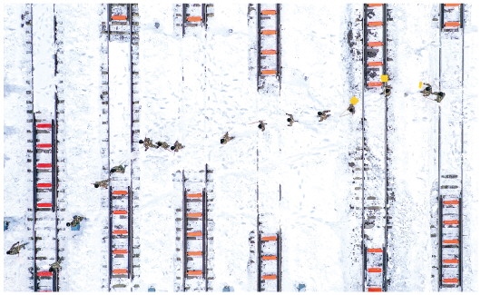 11月11日,在中鐵沈陽局集團有限公司通遼站南編組場,武警官兵在清理積雪。新華社記者連振攝