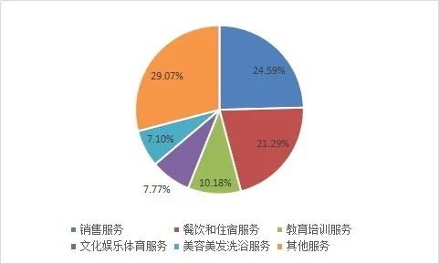 投訴量排在前五位的服務(wù)大類依次為銷售服務(wù)、餐飲和住宿服務(wù)、教育培訓(xùn)服務(wù)、文化娛樂(lè)體育服務(wù)、美容美發(fā)洗浴服務(wù)。
