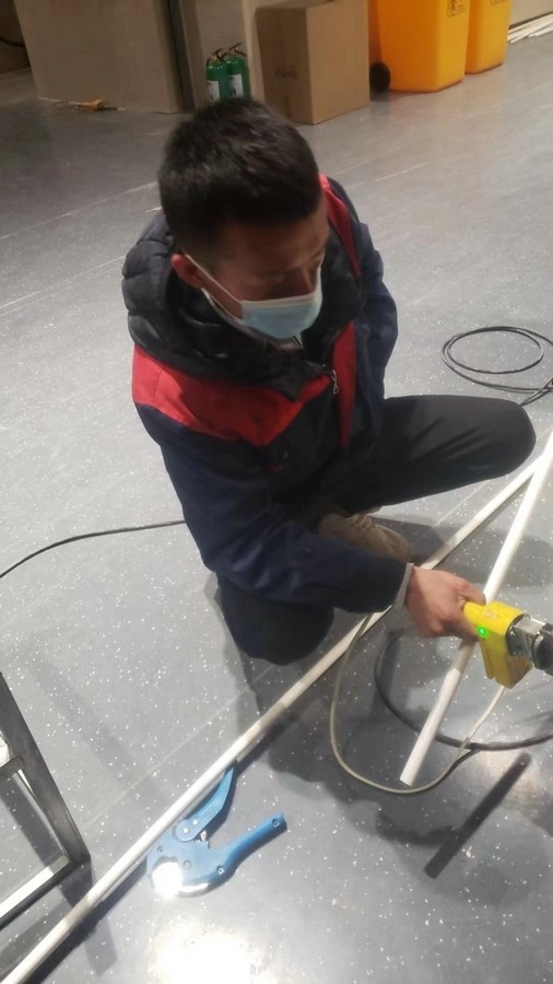 深夜,氣溫突降,冷風(fēng)毫不留情地灌入現(xiàn)場(chǎng)施工人員的衣服里,但無一人松勁、無一人退縮。由于材料分布范圍較大,只見身穿紅、藍(lán)工作服的他們徒步穿梭于各樓層之間,一刻不停地搬運(yùn)管件及材料、安裝設(shè)備。因疫情管控不能到現(xiàn)場(chǎng)的同事則堅(jiān)持利用通訊工具提供遠(yuǎn)程技術(shù)支持,為前線答疑解惑。方艙醫(yī)院建設(shè)屬于應(yīng)急工程,時(shí)間緊、任務(wù)重,加之現(xiàn)場(chǎng)材料缺乏,施工人員只能就地取材,爭(zhēng)分奪秒的同時(shí),“突擊隊(duì)”表現(xiàn)出了高度的專業(yè)性,迅速、細(xì)致、高效地進(jìn)行管道鋪設(shè)和熱水器安裝……凌晨4點(diǎn),在現(xiàn)場(chǎng)全體施工人員的共同努力下,方艙醫(yī)院水暖安裝工作順利完成。