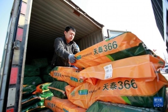2月16日,在山東省臨沂市平邑縣一家種業(yè)公司,工人將玉米種裝車外運(yùn)。