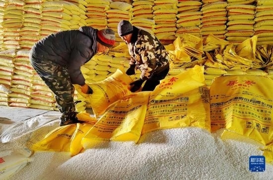 2月16日,北大荒集團(tuán)五大連池農(nóng)場(chǎng)科技服務(wù)中心工人在裝運(yùn)肥料。