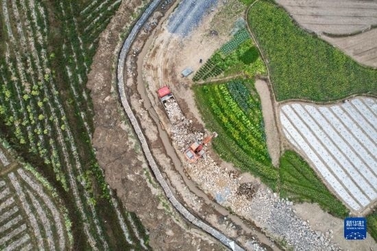 2月16日,在浙江省臺(tái)州市仙居縣雙廟鄉(xiāng),工人在水渠及機(jī)耕道路施工現(xiàn)場(chǎng)施工(無(wú)人機(jī)照片)。