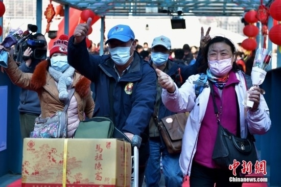 2月19日,搭載59名旅客的“吉順9號”客輪緩緩駛入福州連江黃岐客運碼頭,標志著連江黃岐至馬祖白沙“小三通”客運航線復航。此前,廈門-金門客運航線、福州馬尾-馬祖客運航線、泉州-金門客運航線已相繼復航。圖為兩岸鄉(xiāng)親在黃岐客運碼頭激動相擁。中新社記者 張斌 攝